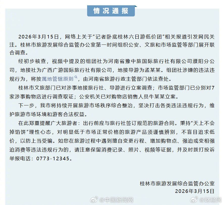 ·桂林通报“记者卧底桂林六日游低价团”:对地接旅行社立案调查。