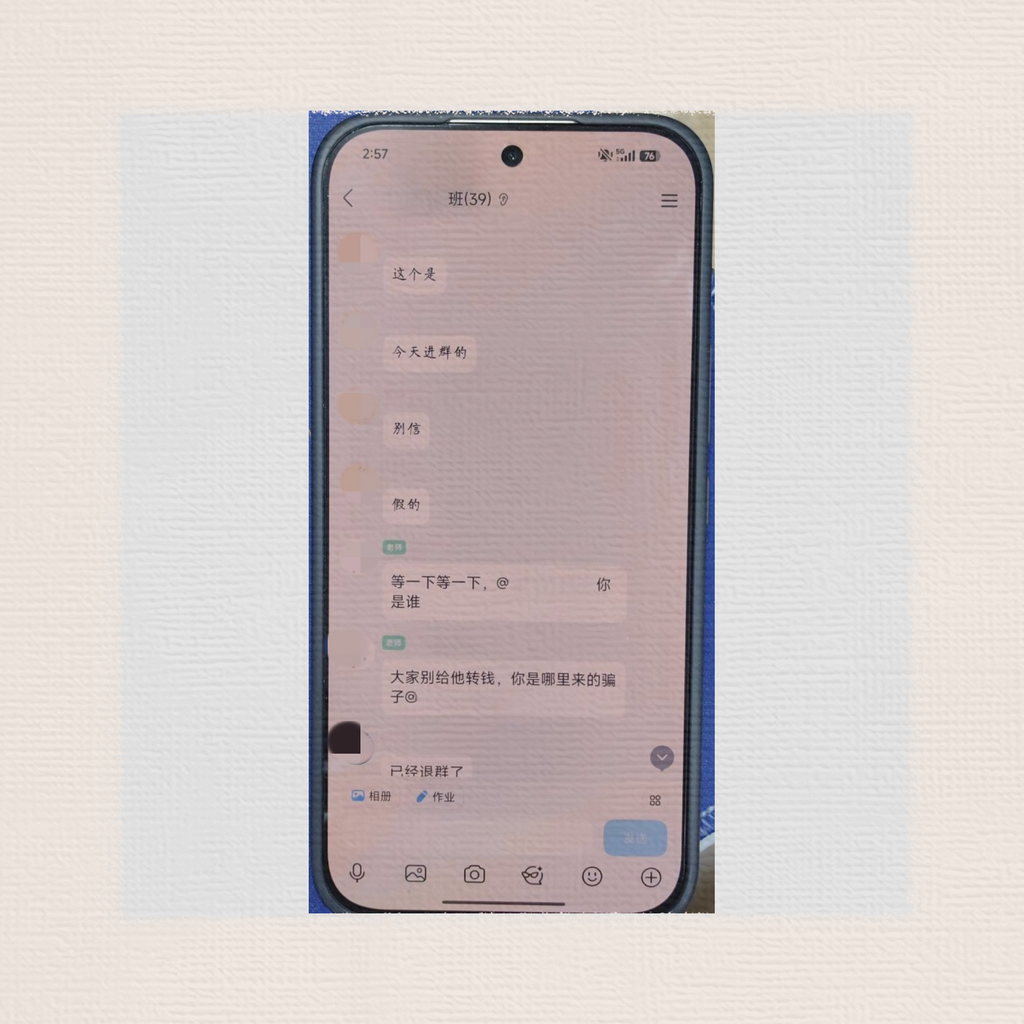凡是在群里自称班主任、老师,以“资料费”“培训费”“教材费”等为由,让您扫码转账的,都是诈骗!