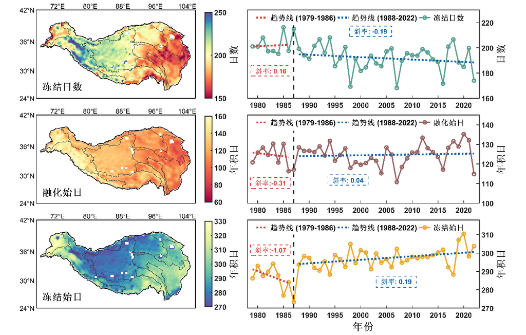 第二部分,青藏高原近地表土壤冻融数据集(TP-DFA-STA),时间跨度更长,从1979年至2023年,空间分辨率约为25公里,为青藏高原近半个世纪的冻融演变提供了高一致性的历史档案。