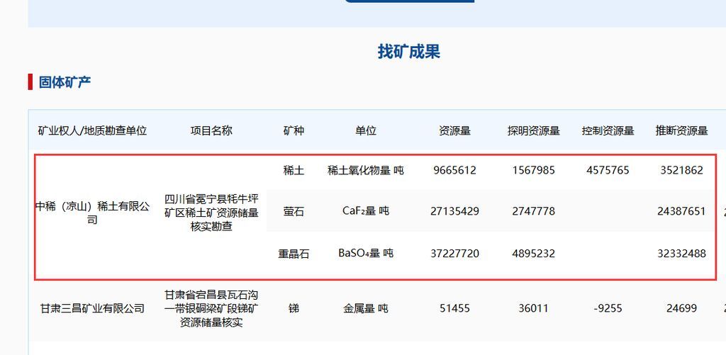 记者今日从自然资源部官网获悉,我国新一轮找矿突破战略行动再添新成果。四川冕宁、甘肃宕昌发现固体矿产,分别是稀土、萤石、重晶石、锑。其中,由中稀(凉山)稀土有限公司实施的“四川省冕宁县牦牛坪矿区稀土矿资源储量核实勘查”项目,发现稀土资源量达9665612吨,萤石资源量达27135429吨,重晶石资源量达37227720吨。