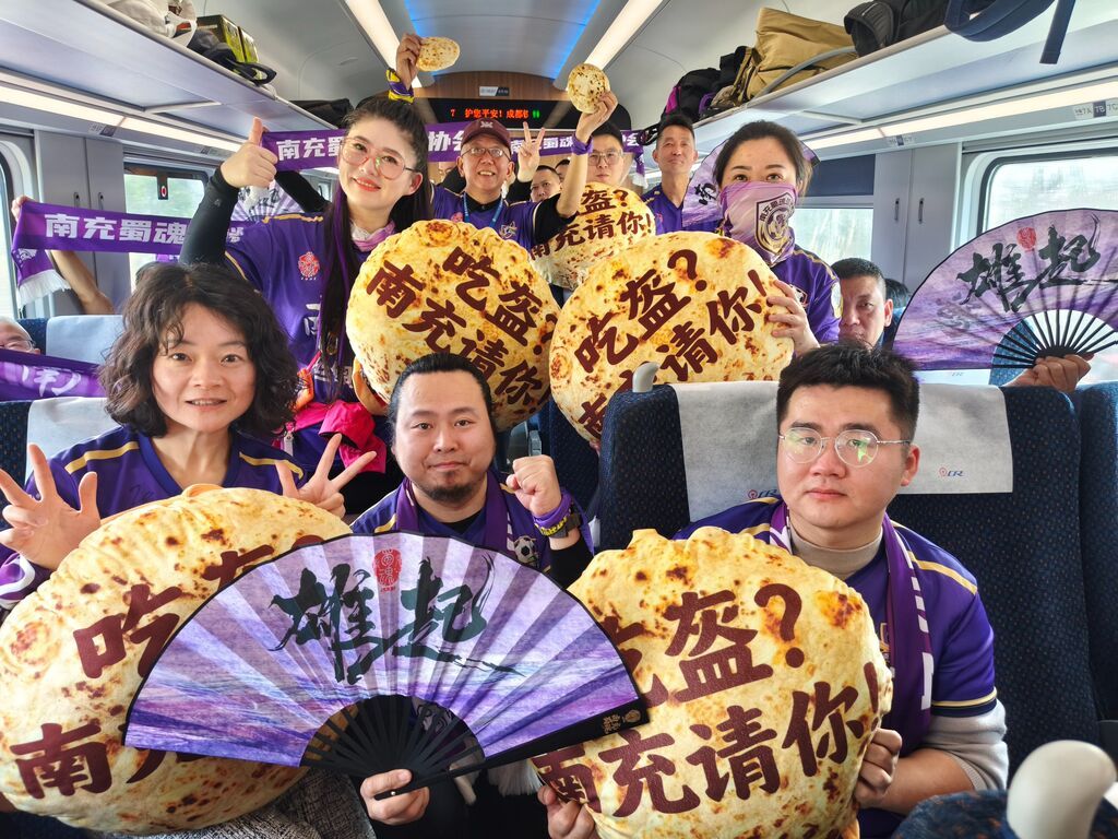 3月21日上午,南充站候车大厅被一片绚丽的“紫色海洋”点亮。这些身着南充丝绸源点队专属紫色助威服的球迷,正是此次远征的主力军。为了见证球队冲击赛季首分,南充球迷组织精心筹划了这趟球迷专列,这是南充球迷继达州、成都客场之后,第三次以包专列的方式远征,充分彰显了“一城一队”的深厚情谊。