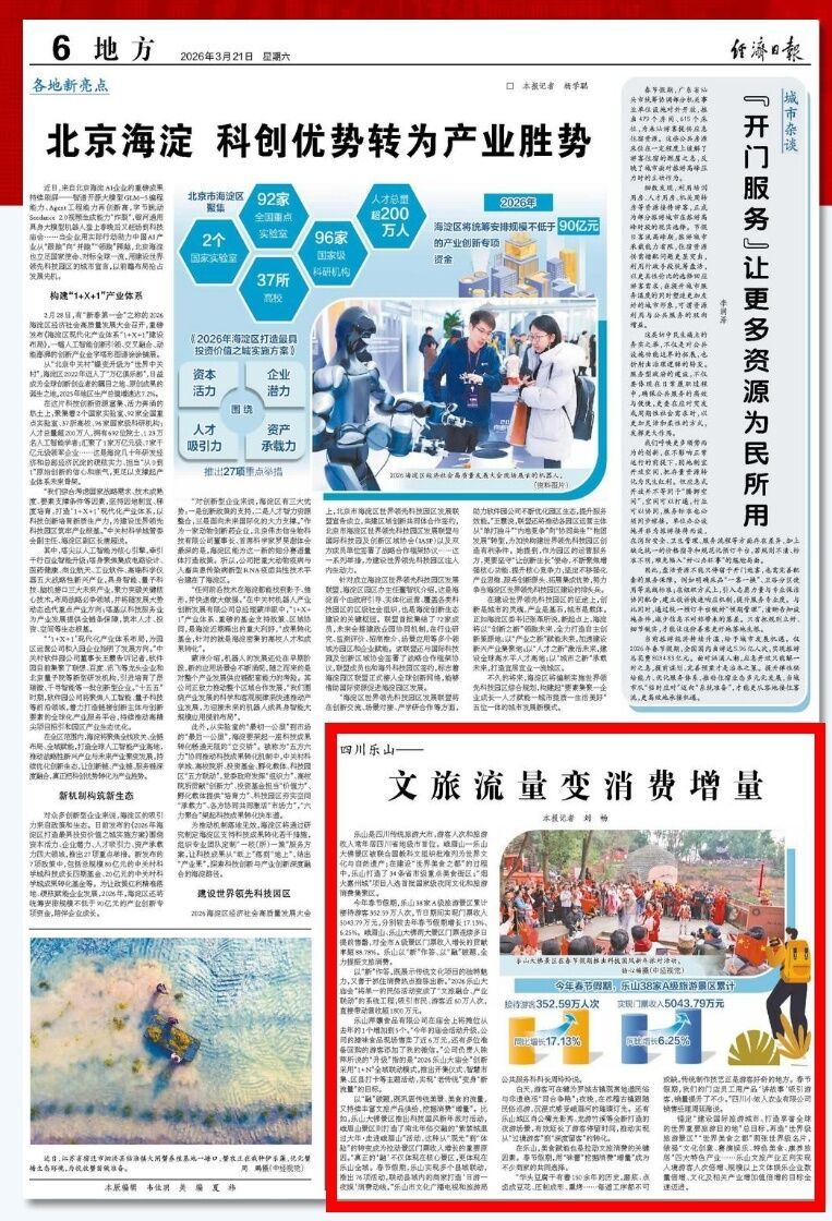 以“融”破题,既巩固传统美景、美食的流量,又持续丰富文旅产品供给,挖掘消费“增量”。比如,乐山大佛景区推出科技国风新年派对活动,峨眉山景区则打造了南北年俗交融的“紫禁城里过大年·走进峨眉山”活动,这种从“观光”到“体验”的转变成为拉动景区门票收入增长的重要原因。“真正的‘融’不仅体现在核心景区,更体现在乐山全域。春节假期,乐山实现多个县域联动,推出76项活动,联动县域内的商家打造‘日游—夜娱’消费动线。”乐山市文化广播电视和旅游局公共服务科科长周玲玲说。