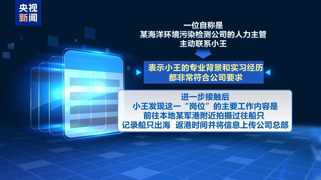 小王大学毕业后,在网上投递简历。一位自称是某海洋环境污染检测公司的人力主管主动联系小王,表示小王的专业背景和实习经历都非常符合公司要求。进一步接触后,小王发现这一“岗位”的主要工作内容是前往本地某军港附近拍摄过往船只,记录船只出海、返港时间并将信息上传公司总部。小王联想到大学期间接受的国家安全教育,果断进行举报。国家安全机关调查发现,该公司存在境外背景,涉嫌拍摄监测我重要军港军舰情况动向。小王因提供重要线索获得国家安全机关奖励。