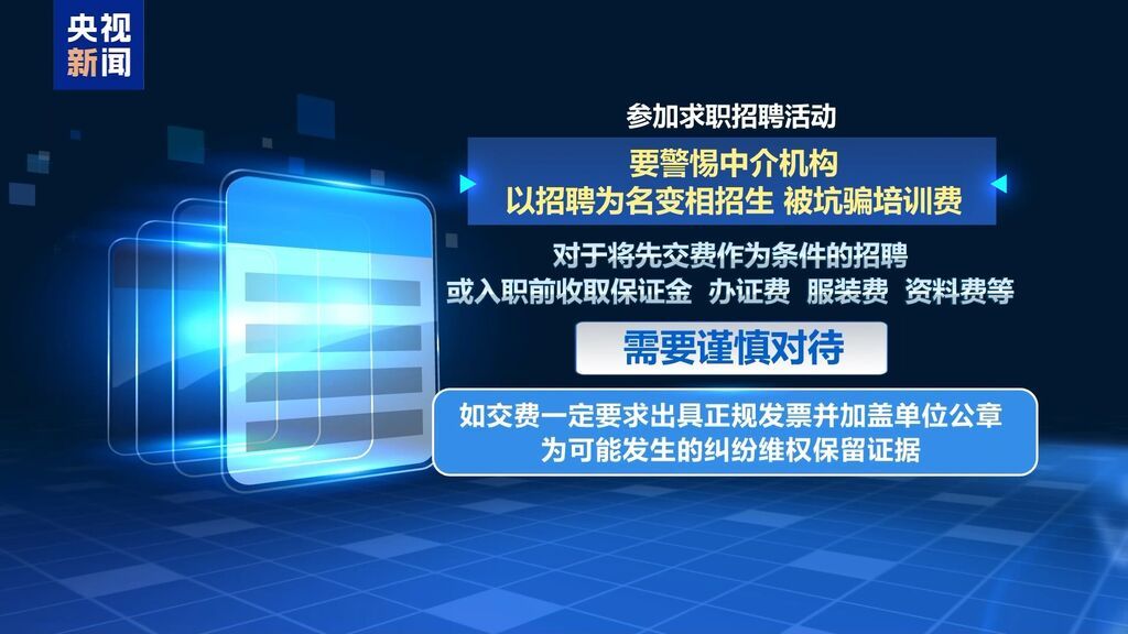 提醒广大求职者,通过中介机构求职应首先核验其合法证照,对各类网络平台招聘信息要注意甄别,可通过官网官微核实,以免受骗上当。参加求职招聘活动要警惕中介机构以招聘为名变相招生,被坑骗培训费。对于将先交费作为条件的招聘或入职前收取保证金、办证费、服装费、资料费等都需要谨慎对待,如交费,一定要求出具正规发票并加盖单位公章,为可能发生的纠纷维权保留证据。
