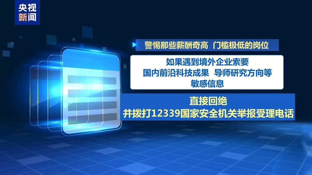 第二,警惕薪酬奇高、门槛极低的岗位。如果遇到境外企业索要国内前沿科技成果、导师研究方向等敏感信息,直接回绝并拨打12339国家安全机关举报受理电话。守护国家安全,就是守护自己的未来。