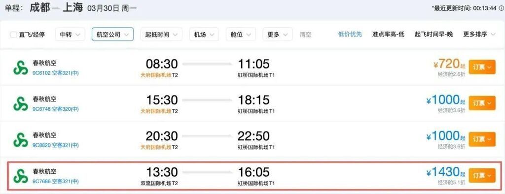 3月22日,记者从航司官网和OTA平台机票销售信息中获悉,3月30日开始,成都双流直飞上海虹桥往返航班出现“9C”开头的春秋航空执飞航班。这是成都双流国际机场进出港航班中继公布本月底将新增“SC”开头的山东航空执飞航班后,再添新的入驻运营航司。