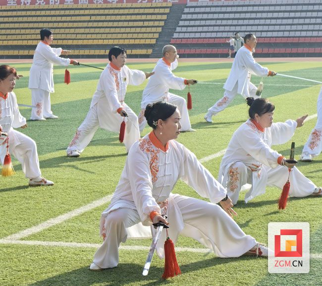 展演现场,队员们精神饱满、仪态从容,依次展示了24式简化太极拳、杨式43式太极拳、38式陈式太极拳、32式太极剑、太极功夫扇等经典套路。大家动作舒展圆活、快慢相间,刚柔相济、气韵连贯,一招一式尽显太极之美与非遗文化魅力,充分展现出荣县太极爱好者健康向上、和谐向善的良好精神风貌。