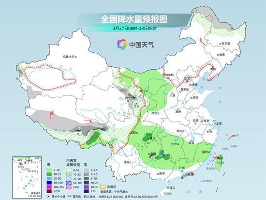 具体来看,中央气象台预计,今天,新疆东南部和沿天山地区东段、西藏东部、甘肃西部、青海大部、川西高原中北部、内蒙古东北部等地部分地区有小到中雪或雨夹雪,其中,新疆东南部和沿天山地区东段、青海东部、甘肃西南部等地部分地区有大到暴雪,局地大暴雪;江南中西部、贵州东部、西藏东南部等地部分地区有中到大雨,其中,贵州中部、湖南中部等地部分地区有暴雨。