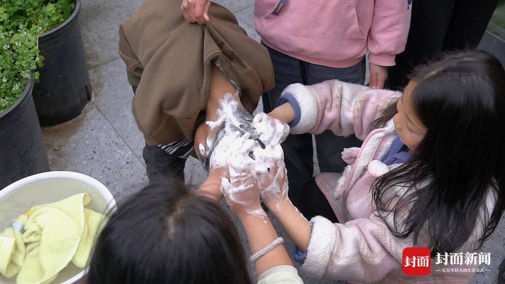 12点钟方向,年长的孩子蹲在水槽边,帮年幼的孩子洗头发;先洗完的,移步3点钟方向的碗柜旁,挨个吹干;随后到6点钟方向的木条桌前,做作业、看课本。9点钟方向的台阶下连着厨房,果爸守着灶台炖排骨,不时飘来香味。碗柜旁立着一台三门冰柜,五层空间食材塞得满当当。