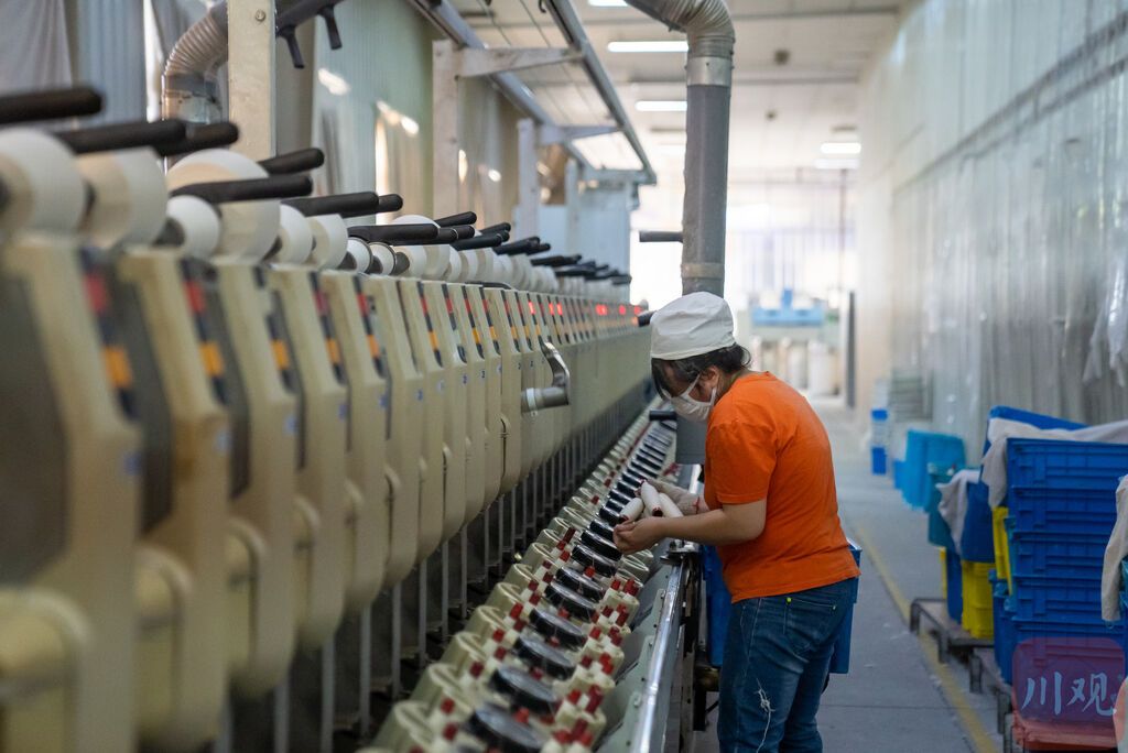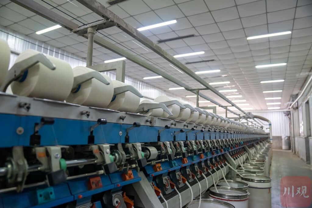 在遂宁,四川佐鲁银华纺织有限责任公司纺纱车间内机器轰鸣,12组细纱机飞速运转,以每分钟上千米的速度将一根根细如发丝的纱线缠绕上络筒,“一个络筒就是15万米纱线,断线机器会自动打结。”公司总经理袁国民说。