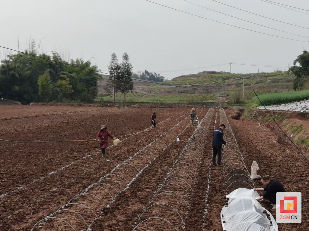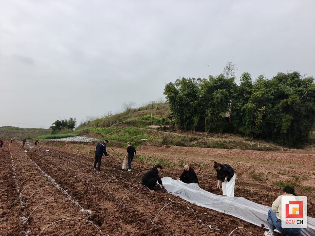 清晨的田埂上,晨光洒在翻耕后的红土地上,泛着温润的光泽。一排排银色育秧拱架整齐延伸,与远处的青山翠竹相映成趣。育秧现场,农户们有的弯腰翻耕整地,将板结的土壤敲碎耙平;有的细心搭建拱架,将玻纤管稳稳插入田垄;有的手提谷桶精准播种,让谷种均匀落入苗床;还有的合力铺展天膜,用泥土压实边缘,为秧苗搭建起温暖的“温室”。
