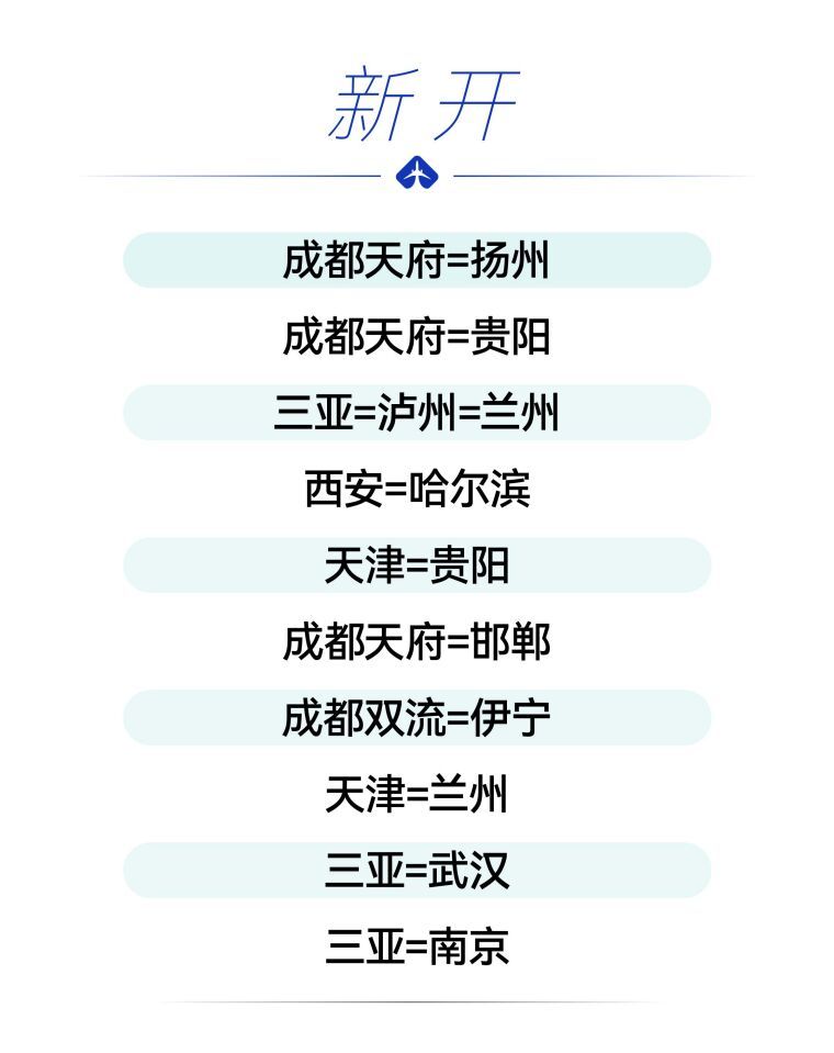 2026年民航夏秋航季将于3月29日开启。3月25日,四川航空发布消息,新航季计划执行航线290余条,包括国内航线250余条、国际及地区航线30余条,通航境内外128个城市。其中,川航将新开成都双流—伊宁、成都天府—扬州等10条航线,恢复成都天府—敦煌、重庆—烟台、三亚—绵阳—西宁等18条航线。