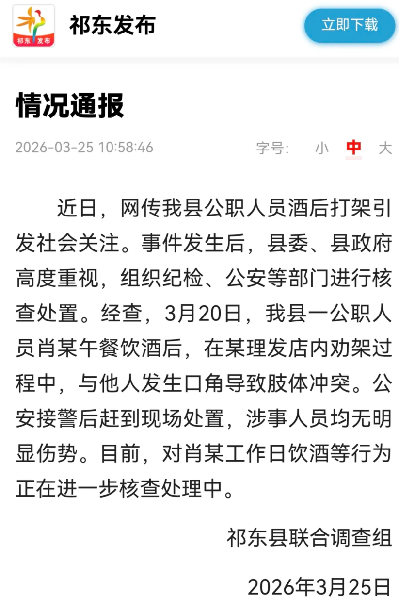 ·湖南祁东通报一公职人员酒后打架。