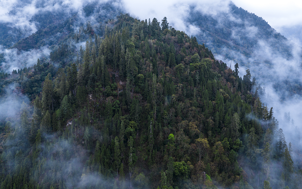 西藏林芝,帕隆藏布大峡谷春雨后云雾缭绕,河水悠扬,呈现一幅美丽的春日风光。