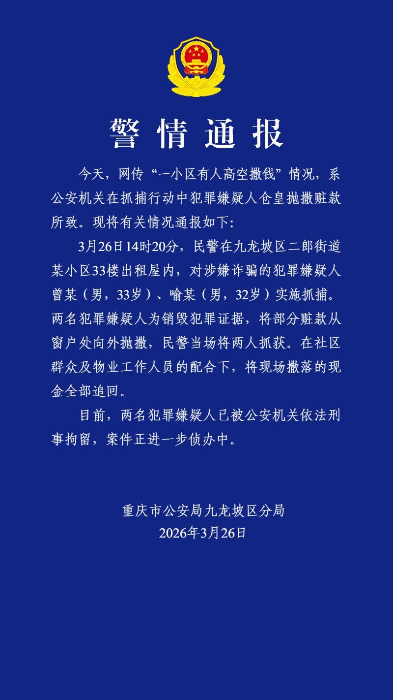 3月26日14时20分,民警在九龙坡区二郎街道某小区33楼出租屋内,对涉嫌诈骗的犯罪嫌疑人曾某(男,33岁)、喻某(男,32岁)实施抓捕。两名犯罪嫌疑人为销毁犯罪证据,将部分赃款从窗户处向外抛撒,民警当场将两人抓获。在社区群众及物业工作人员的配合下,将现场撒落的现金全部追回。