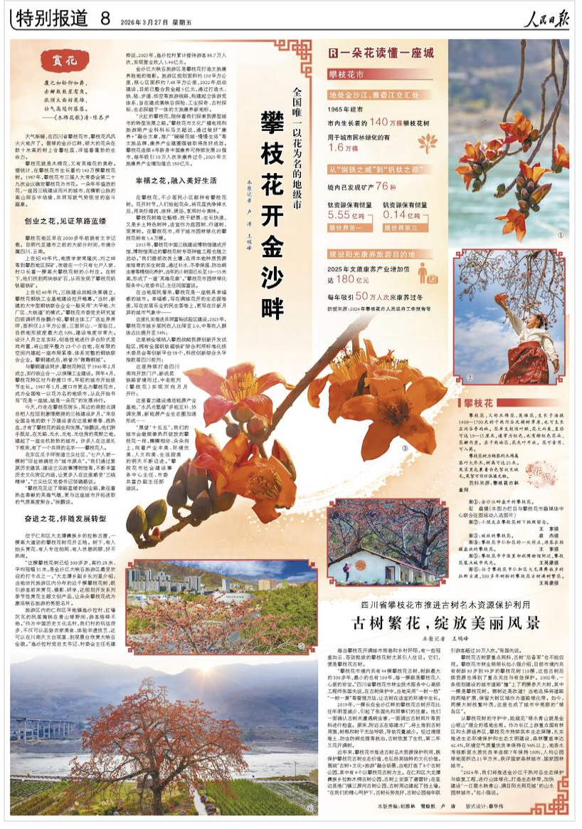 近年来,攀枝花市推进古树名木资源保护利用,既保护攀枝花古树生态价值,也弘扬其独特的文化价值。围绕“古树+文化+旅游”融合场景,当地打造了8个古树公园,其中有4个以攀枝花古树为主。在仁和区大龙潭彝族乡拉鲊木棉古树公园,古树上安装了避雷针;在盐边县渔门镇三源河古树公园,古树周边建起了挡土墙。“在我们的精心呵护下,古树长势良好,古树公园每年吸引游客超过30万人次。”张国先说。