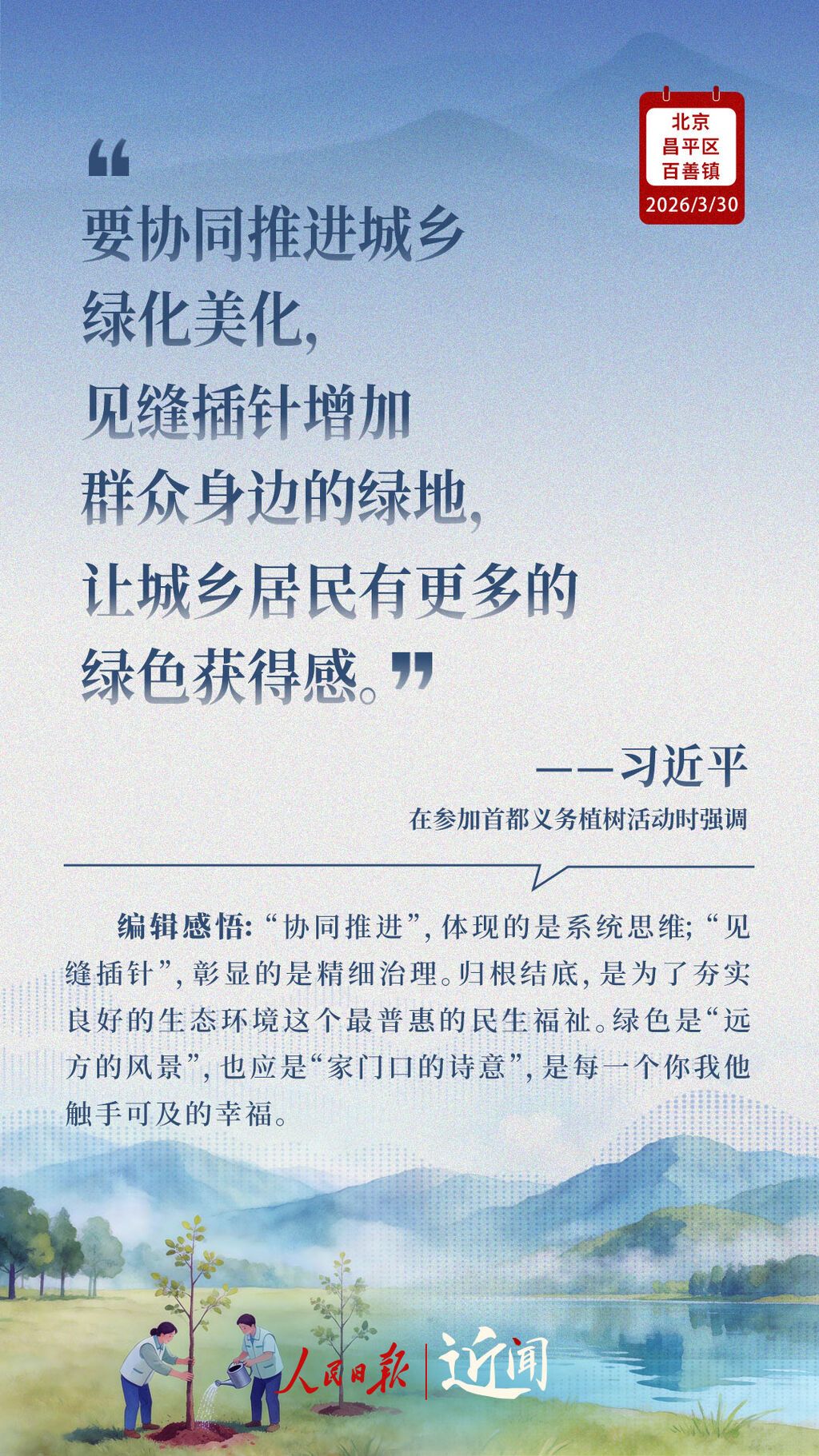 春风煦暖,又一场绿色约定。3月30日,习近平总书记来到北京市昌平区百善镇,同干部群众一起参加义务植树。