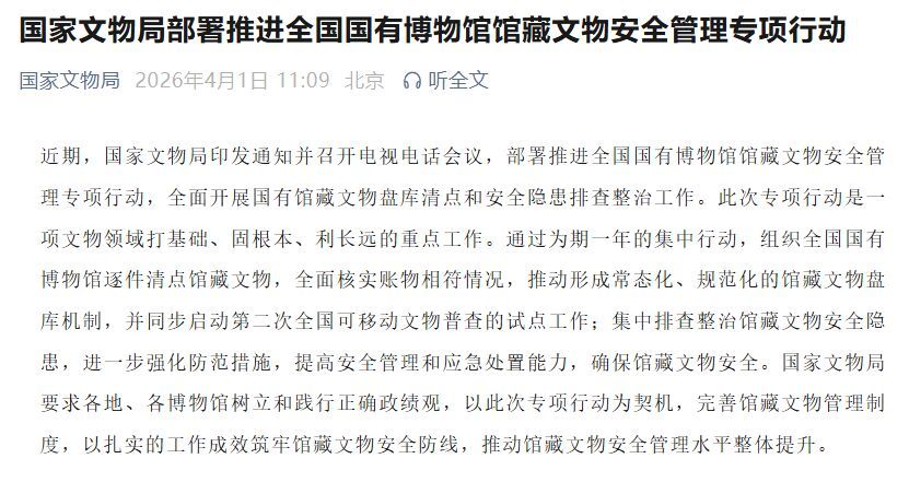 国家文物局统筹推进、不断深化馆藏文物安全管理工作。2025年12月召开的全国博物馆工作会议强调,要把藏品管理始终放在博物馆工作的首要位置,系统开展收藏、保护、研究、阐释,相关工作部署与重点任务将纳入文物事业“十五五”发展规划。此后,国家文物局深入核查处置相关舆情涉及的博物馆藏品管理问题,印发《关于加强博物馆安全工作的通知》《关于进一步规范国有博物馆接受捐赠藏品管理工作的通知》,督促指导各级文物行政部门和博物馆加强藏品管理基础工作,规范藏品定级、登账、建档和出入库等操作流程;严格履行捐赠藏品接收入藏程序,切实承担捐赠藏品保护利用责任。