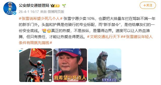 4月1日,@公安部交通管理局 发文力挺张雪: