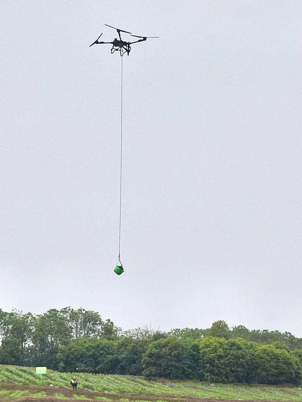 说干就干,孙雪峰从合作社仓库里搬出之前花6万元购置的农用无人机,并购置了装秧苗的塑料吊篮。他严格按照无人机安全飞行规范操作,起飞前仔细检查飞行器、绳索和吊篮,要求飞手统一穿戴反光衣和安全帽,确保吊运作业安全。