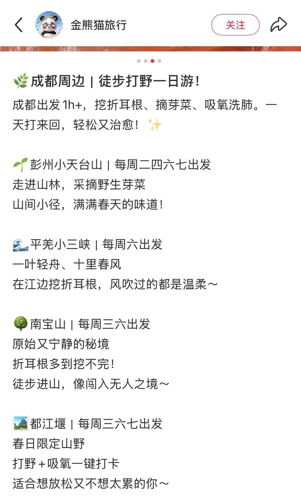 年轻人的追捧,催生出越来越标准的“打野”团。博主@自由者不二家旅行介绍,仅4月1日至6日,就推出40多个“徒步+打野”线路,价格在50元至100元不等,包含车费、门票与清洁费,30人即可成团。
