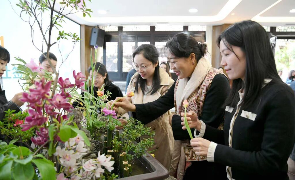 活动现场,学校代表在特制的成都区划地图上签下校名,勾勒出馆校联动的地域脉络。最具文化韵味的环节当属花艺签约仪式:成都杜甫草堂博物馆馆长、中华诗歌研究院执行院长王飞率先在插花器中插入一枝牡丹花,每所学校代表完成签约后,也将一枝鲜花插入花艺作品中,寓意馆校合作繁花似锦、诗教事业薪火相传。庄重的仪式感与雅致的传统文化意趣相得益彰,赢得现场阵阵掌声。此次合作创作的花艺作品,将作为成都杜甫草堂博物馆“每月一推”的四月花神插花作品,在盆景园面向公众展出。