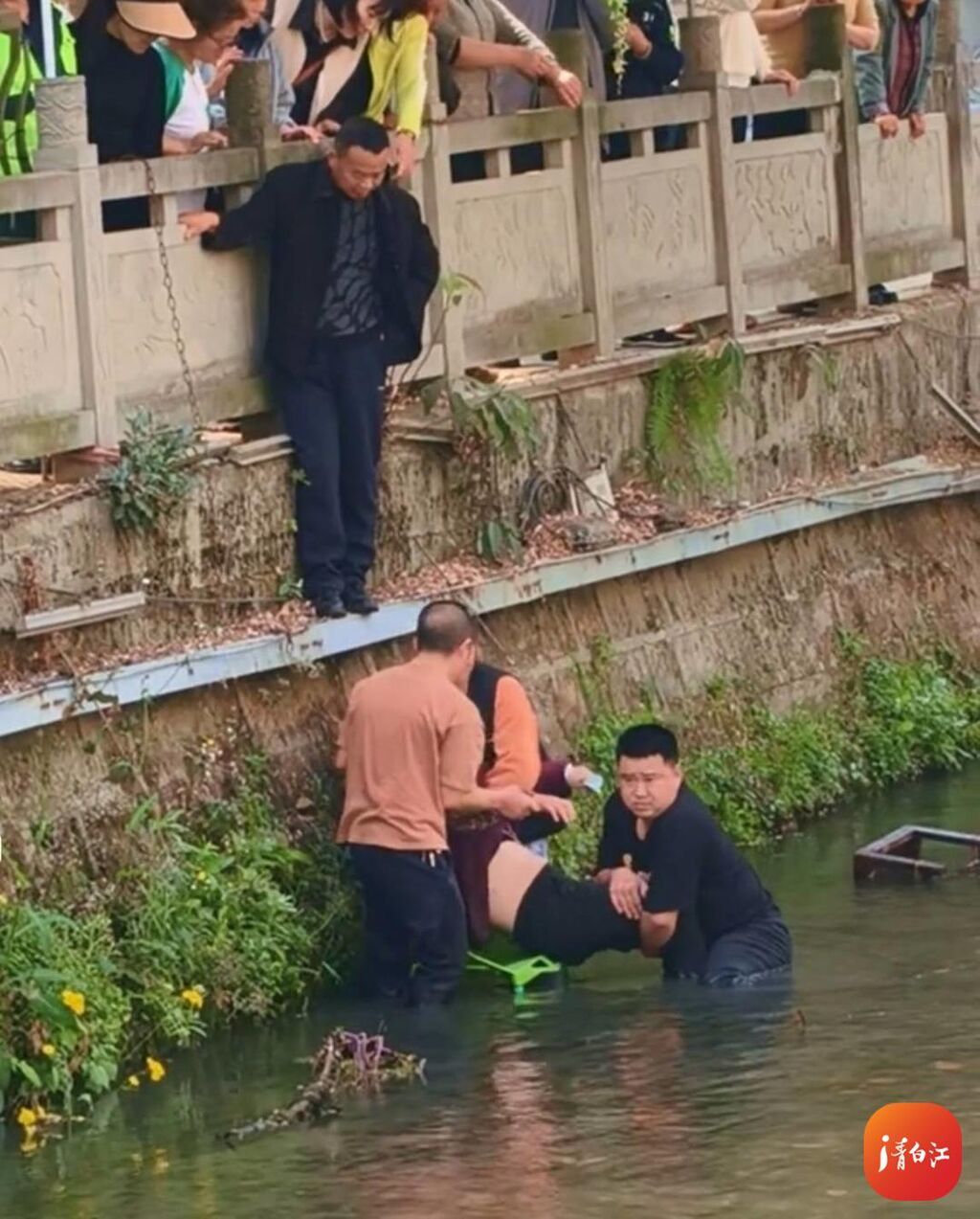 清城河石家碾西段,网友镜头下的三人救人场景。