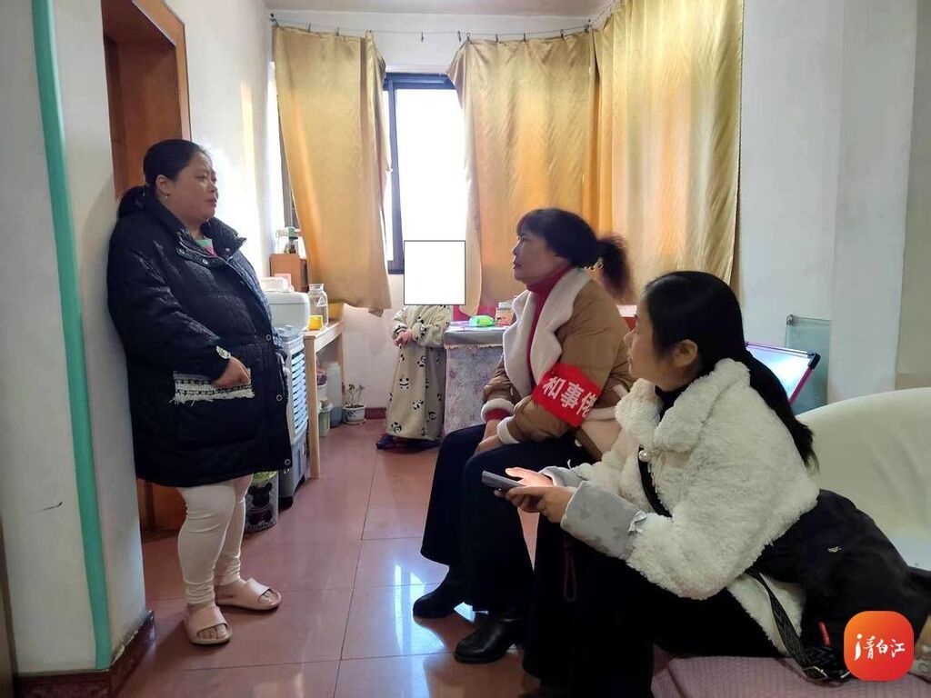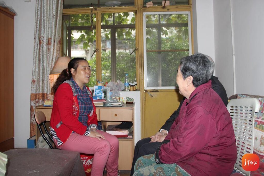 青江路社区微网格员钟江荣(右)、李脉蓉(中)到晏双家里了解情况。