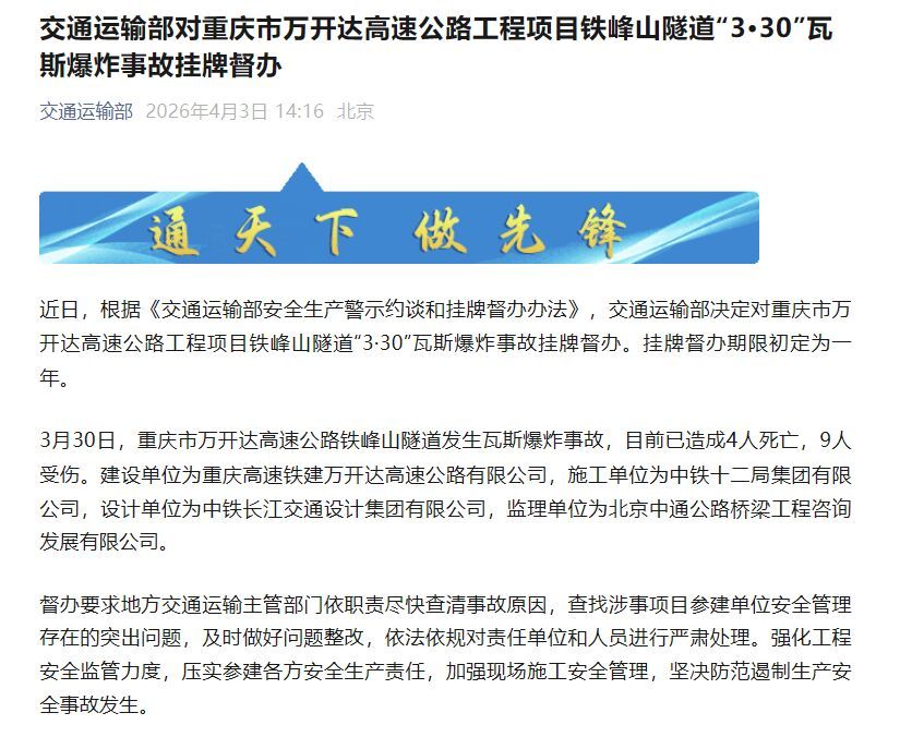 近日,根据《交通运输部安全生产警示约谈和挂牌督办办法》,交通运输部决定对重庆市万开达高速公路工程项目铁峰山隧道“3·30”瓦斯爆炸事故挂牌督办。挂牌督办期限初定为一年。