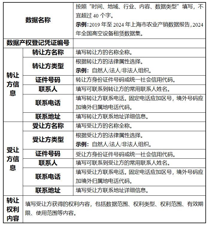 申请转让登记的,登记申请人应当提交转让登记申请表(参考模板见附件2)、转让合同、初次登记凭证等材料。登记机构受理转让登记并审查通过的,应当相应调整转让方的数据产权登记凭证。