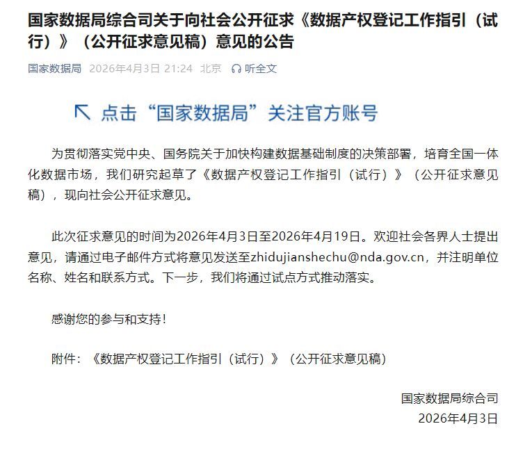 为贯彻落实党中央、国务院关于加快构建数据基础制度的决策部署,培育全国一体化数据市场,我们研究起草了《数据产权登记工作指引(试行)》(公开征求意见稿),现向社会公开征求意见。