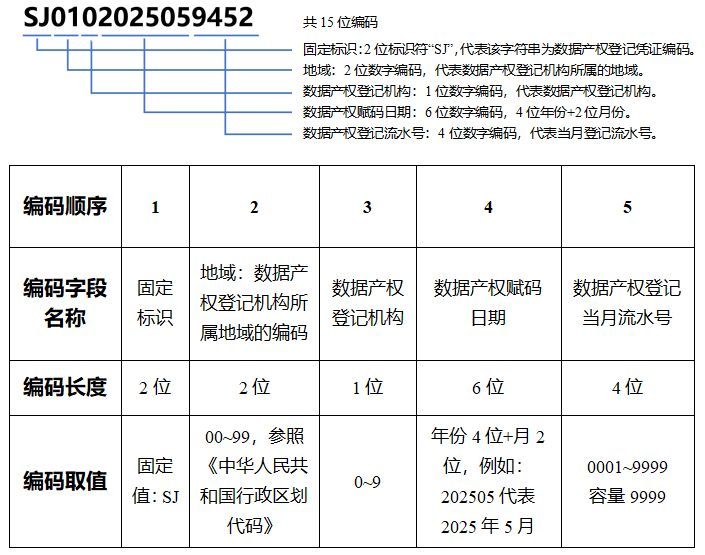 凭证编码共15位,由字母及数字构成。编码规则为:按从左至右的顺序,由固定标识(2位)、地域(2位)、数据产权登记机构(1位)、数据产权赋码日期(6位)、数据产权登记流水号(4位)构成。