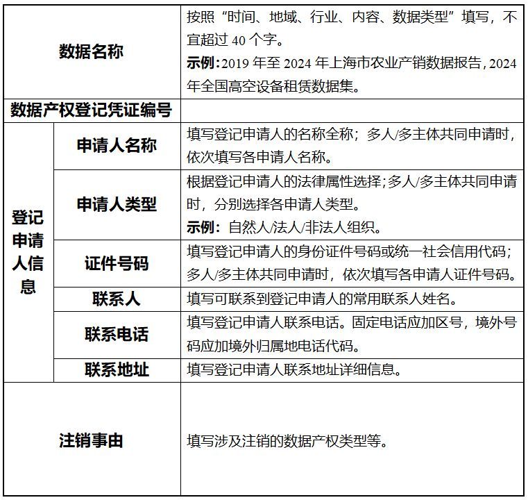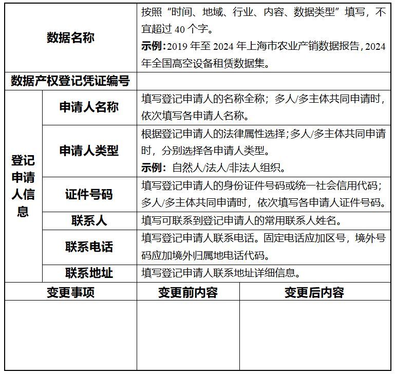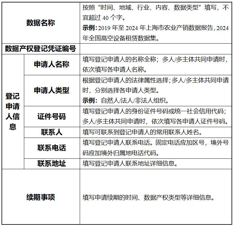 申请办理初次登记的,登记申请人应当提交初次登记申请表(参考模板见附件1)、登记申请人身份佐证材料、数据产权合法取得的佐证材料,以及数据样例和数据描述等材料。