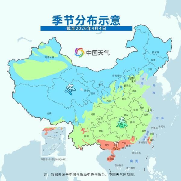 今年华南一带入夏偏早,目前夏季前沿已经推进到了广西中部、广东北部一带。而春季前沿大致和常年相当,位于华北中部。
