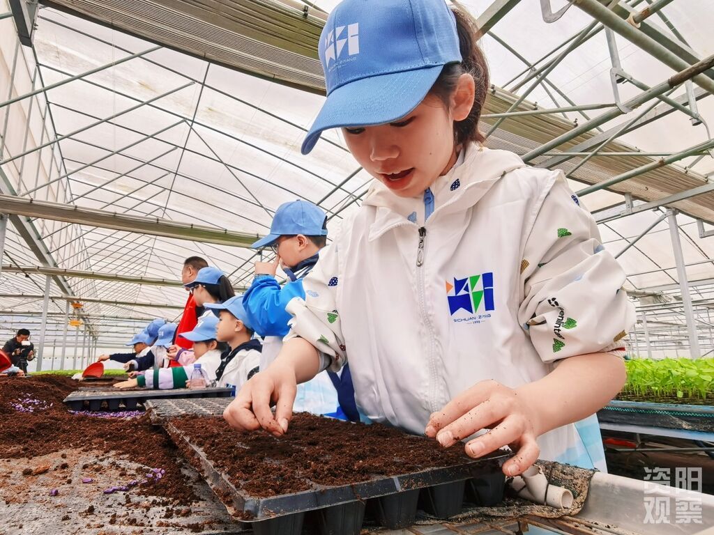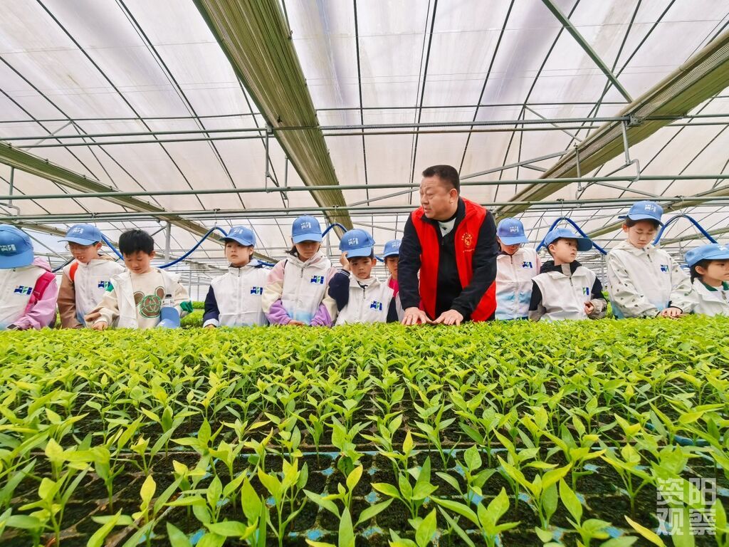 近日,在资阳临空经济区蔬菜现代农业产业园区的育苗温室里,嫩绿的辣椒苗整齐排列,生机盎然。村党支部副书记王雪良当起了临时老师,从选种、播种到温湿度调控,把育苗的智慧耐心讲给孩子们听。