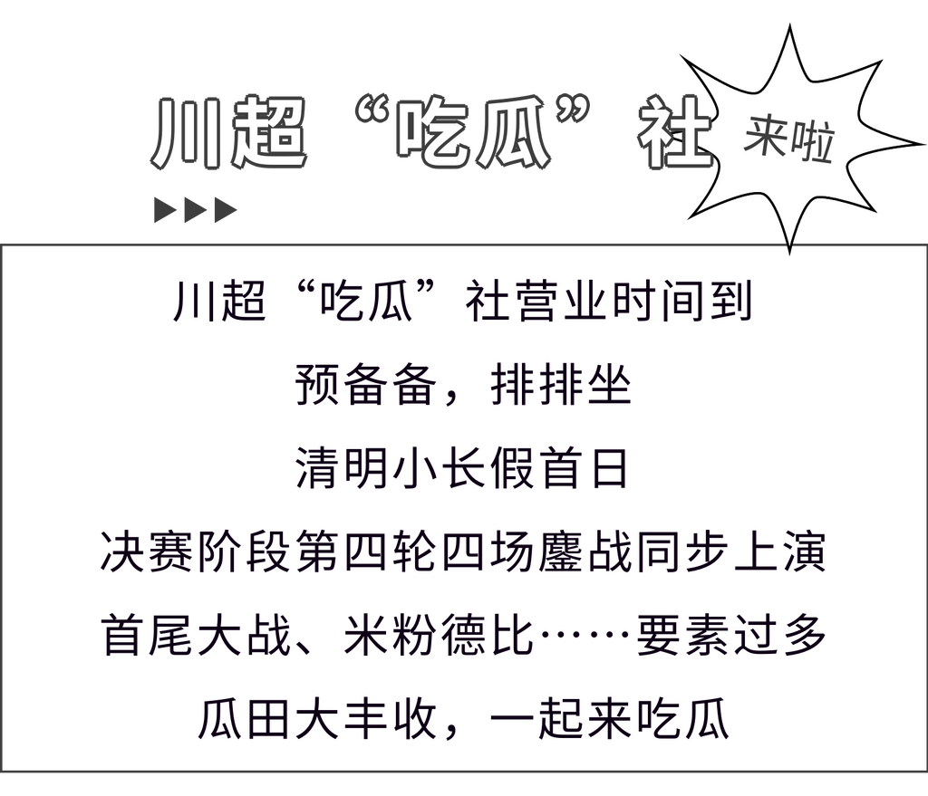 下一轮大战4月11日开启,不知道又会有哪些名场面和热梗出圈?咱们继续蹲守川超“吃瓜”社,一起解锁“川超”的更多精彩!