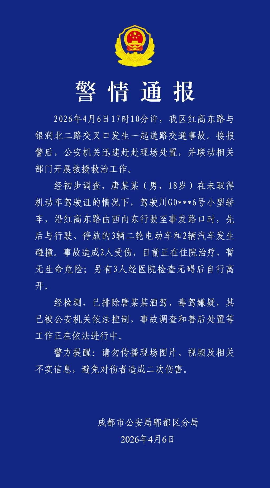 ·18岁男子无证驾驶轿车发生碰撞,成都警方通报。