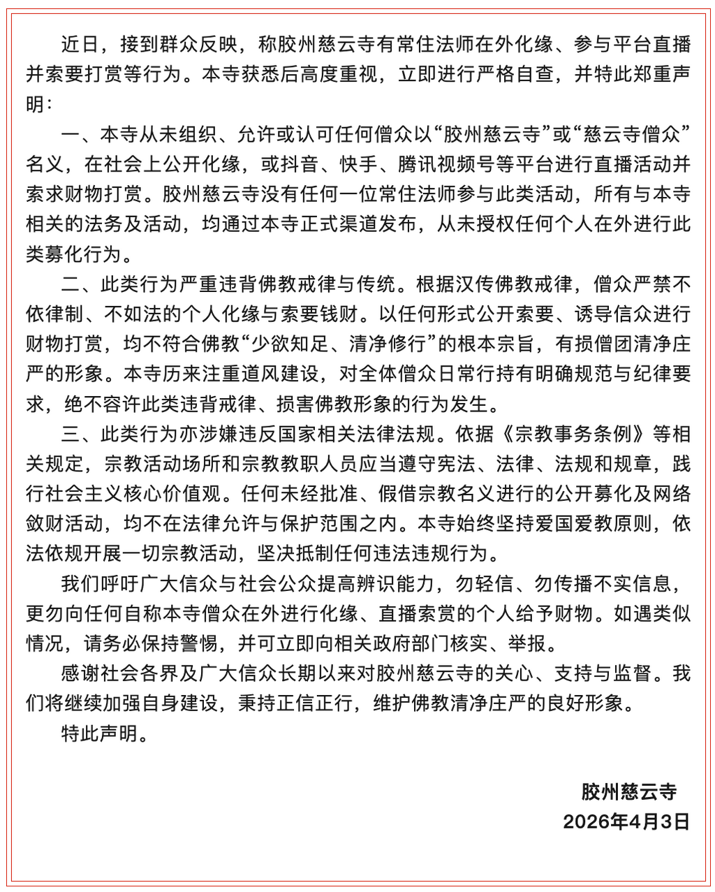 ·有僧侣在外化缘、直播索赏?胶州慈云寺:无常住法师参与此类活动。