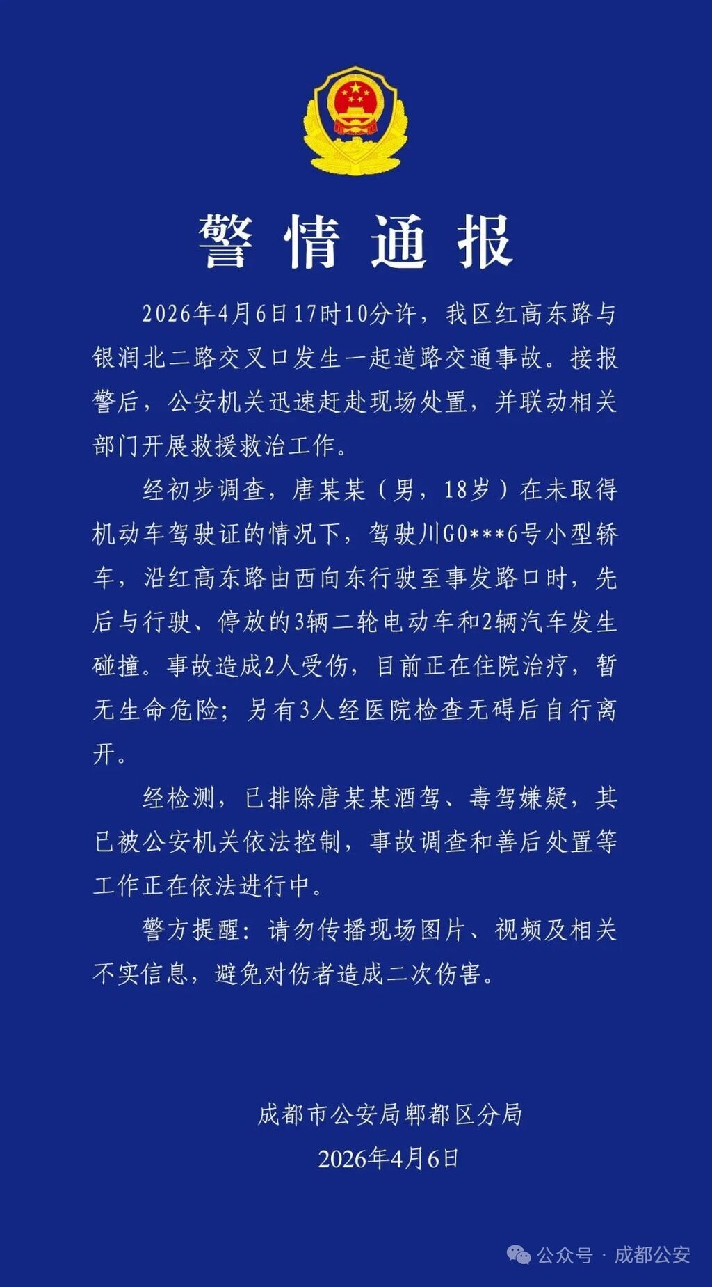 经初步调查,唐某某(男,18岁)在未取得机动车驾驶证的情况下,驾驶川G0***6号小型轿车,沿红高东路由西向东行驶至事发路口时,先后与行驶、停放的3辆二轮电动车和2辆汽车发生碰撞。事故造成2人受伤,目前正在住院治疗,暂无生命危险;另有3人经医院检查无碍后自行离开。