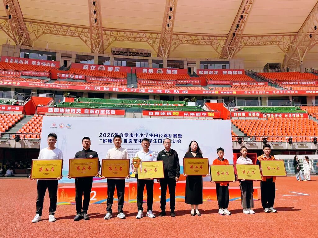 4月3日,2026年自贡市中小学生田径锦标赛暨“多康杯”自贡市中小学生田径运动会在南湖体育中心圆满落幕。荣县派出5支队伍、119名学生参赛,凭借强劲实力包揽小学组两项团体冠军——旭光小学斩获小学甲组团体总分第一,树人小学夺得小学乙组团体总分第一。