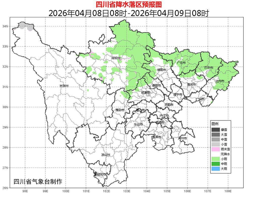 今天白天到晚上:盆地大部阴天转多云,其中广元、巴中、达州3市和西北部沿山有阵雨或雷雨;阿坝州大部阴天间多云有分散阵雨或雷雨,甘孜州和攀西地区多云间晴。