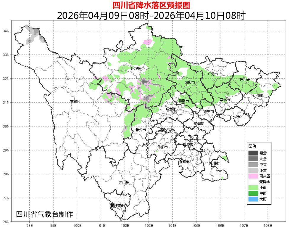 9日白天到晚上:盆地大部多云,其中广元、绵阳、德阳、巴中4市和南充、达州2市北部及西部沿山早晚有分散阵雨或雷雨;阿坝州大部和甘孜州东部阴天间多云有分散阵雨或雷雨,甘孜州其余地方和攀西地区多云间晴。