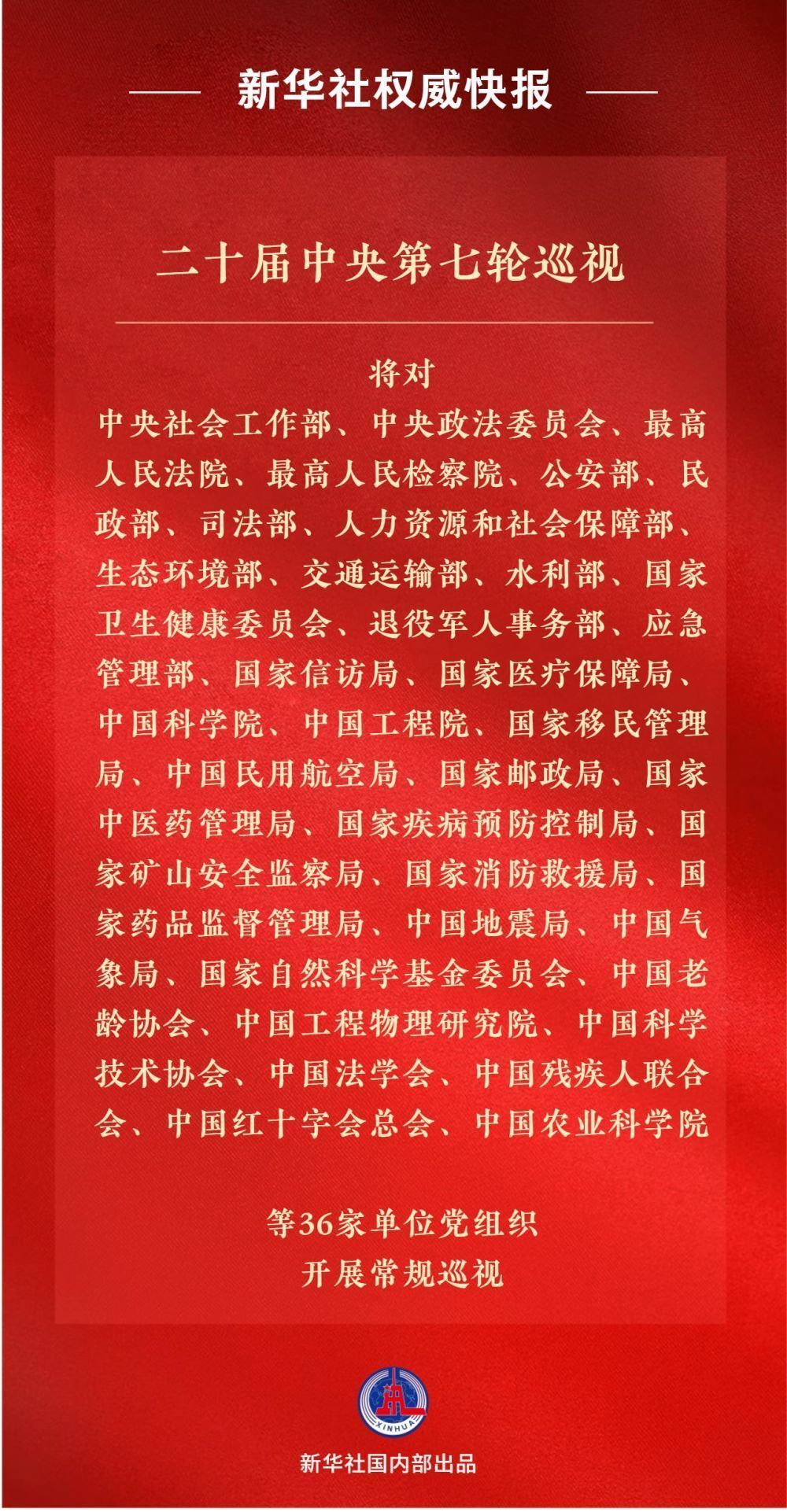 经党中央批准,二十届中央第七轮巡视将对中央社会工作部、中央政法委员会、最高人民法院、最高人民检察院、公安部、民政部、司法部、人力资源和社会保障部、生态环境部、交通运输部、水利部、国家卫生健康委员会、退役军人事务部、应急管理部、国家信访局、国家医疗保障局、中国科学院、中国工程院、国家移民管理局、中国民用航空局、国家邮政局、国家中医药管理局、国家疾病预防控制局、国家矿山安全监察局、国家消防救援局、国家药品监督管理局、中国地震局、中国气象局、国家自然科学基金委员会、中国老龄协会、中国工程物理研究院、中国科学技术协会、中国法学会、中国残疾人联合会、中国红十字会总会、中国农业科学院等36家单位党组织开展常规巡视。
