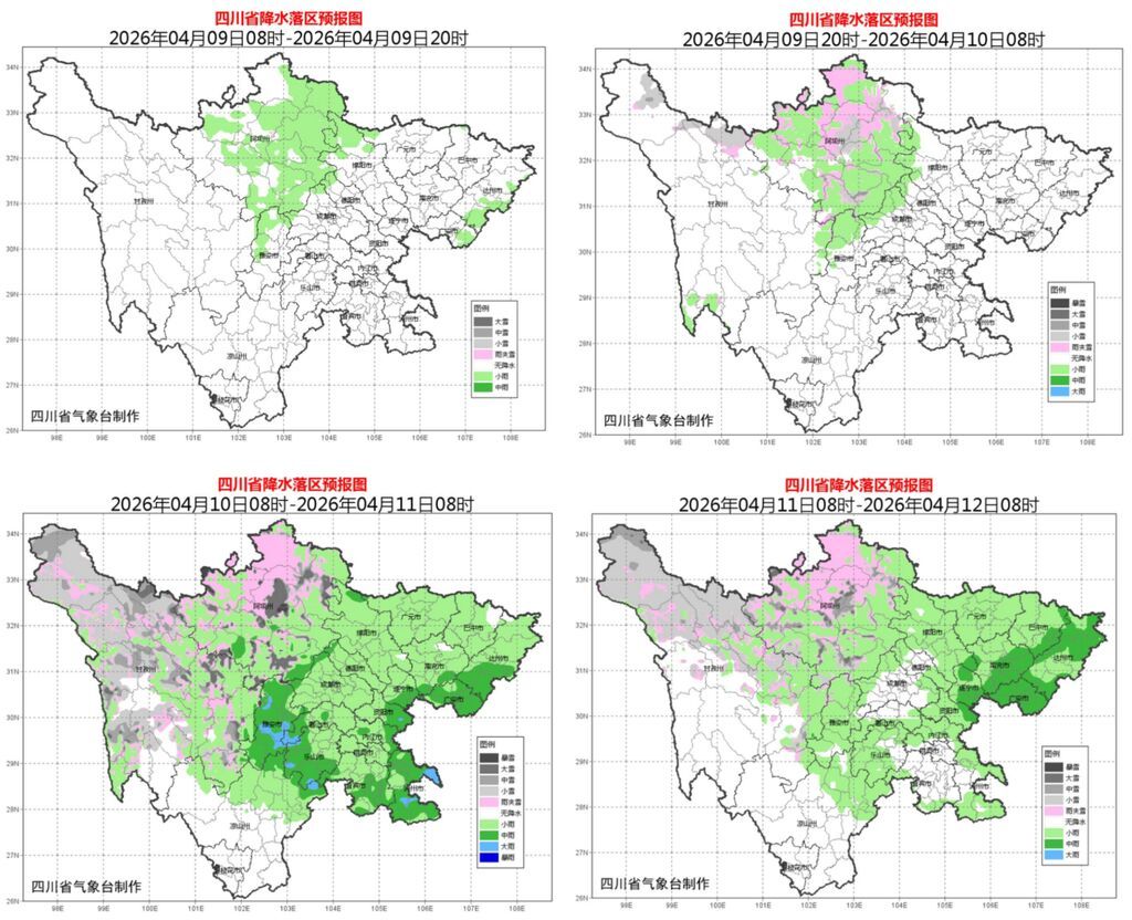 10日白天到晚上,盆地大部多云转阵雨或雷雨,其中西南部和东部的部分地方有中雨,个别大雨;阿坝州、甘孜州大部和凉山州北部阴天间多云有分散阵雨(雪)或雷雨,局部中雨或中雪,攀西地区的其余地方多云间晴。