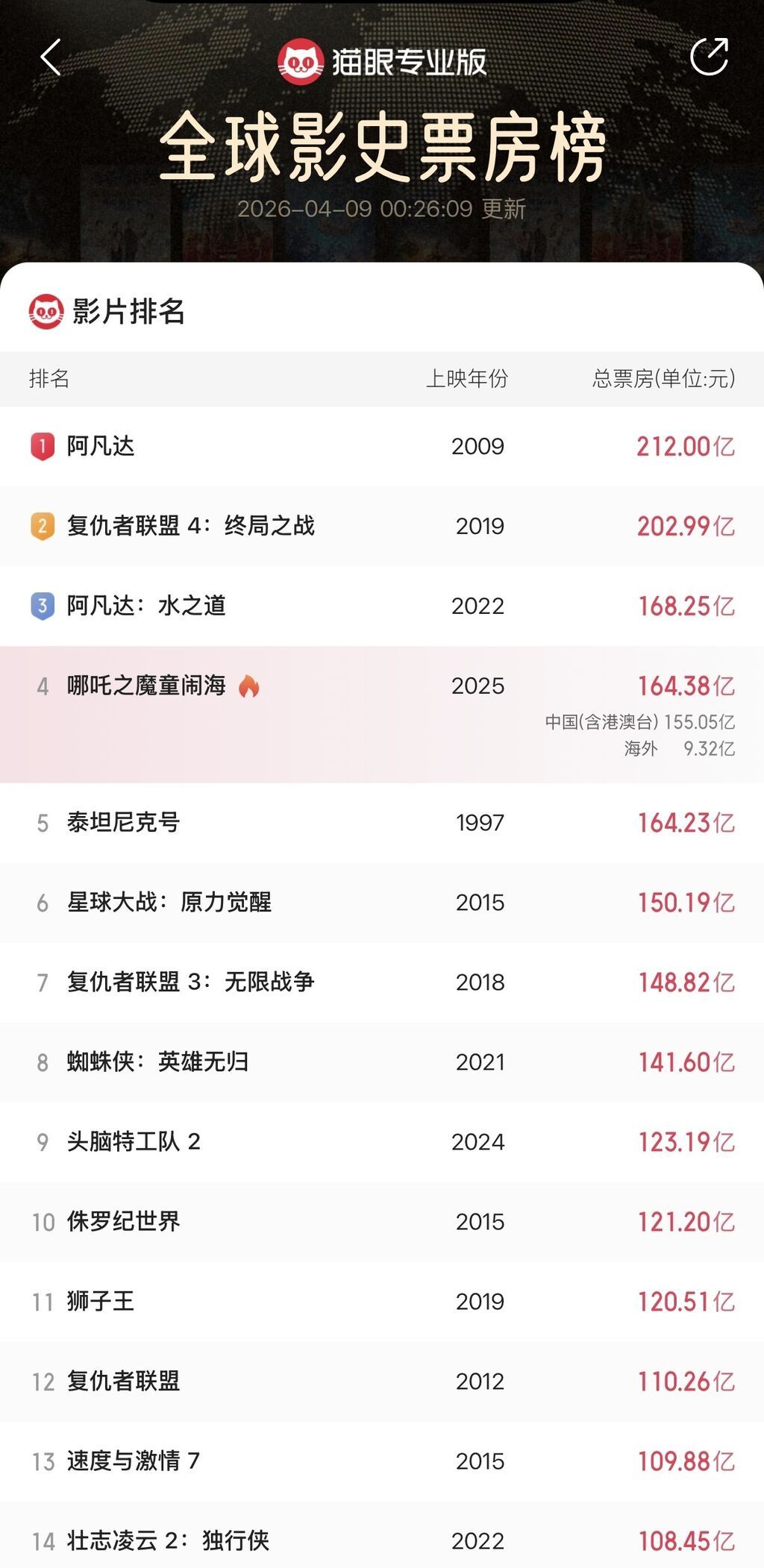 《哪吒之魔童闹海》(下称《哪吒2》)票房又破纪录了。截至4月8日,猫眼专业版数据显示,“四川造”动画电影《哪吒2》全球票房达22.67亿美元,以0.03亿美元的优势超越《泰坦尼克号》(22.64亿美元),升至全球影史票房榜第四位,海外电影票房统计平台Box Office Mojo也更新了相关信息。