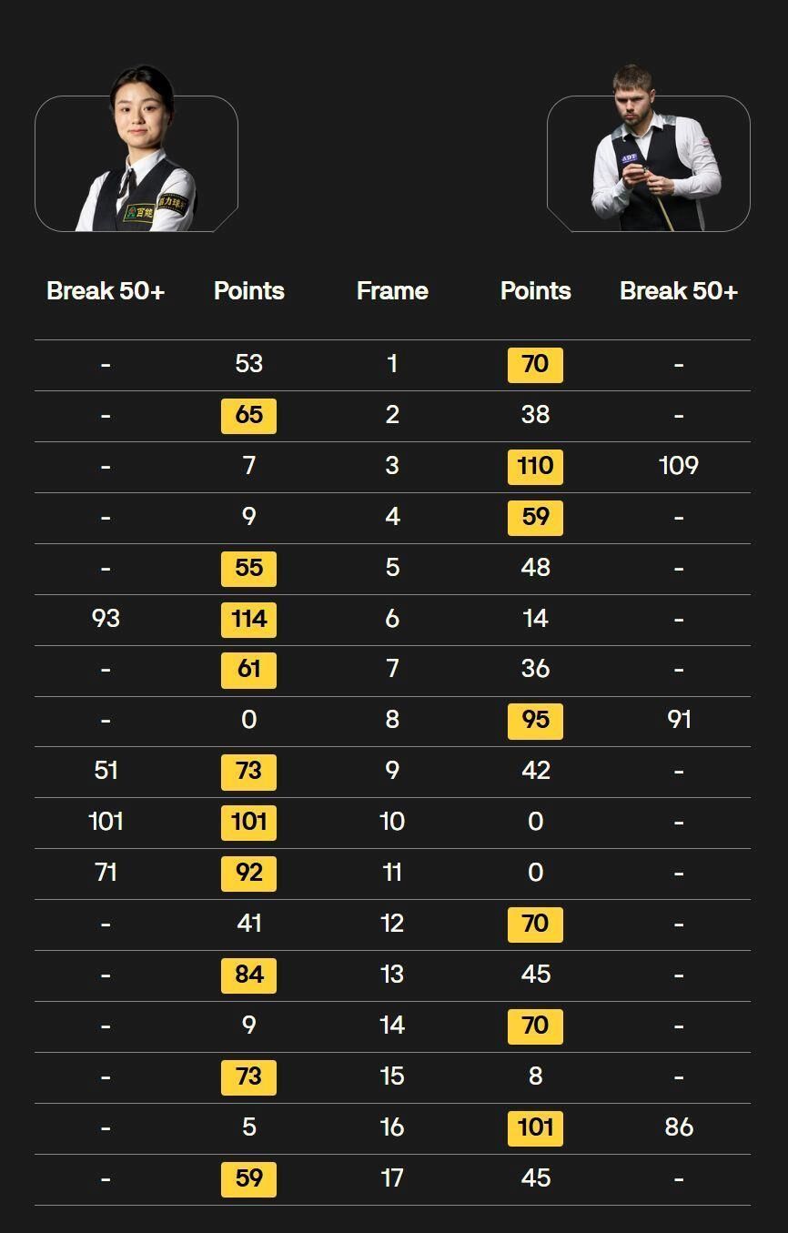 在首轮比赛中,她便以单杆101分、总比分10-7战胜英格兰选手丹尼尔·沃默斯利,成为首位在世锦赛资格赛长局制比赛中获胜的中国女选手,实现了历史性突破。