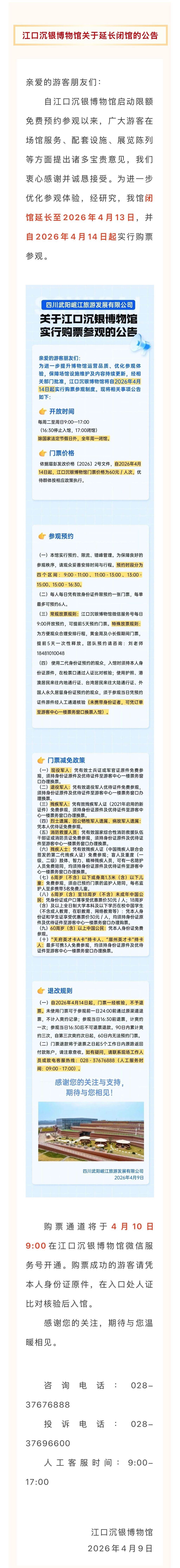 “临时闭馆期间,我们认真梳理了前期收集到的游客意见建议,发现公众对场馆服务、配套设施、展览陈列等方面有更高期待。”江口沉银博物馆相关负责人表示,为进一步优化参观体验,经研究决定,将闭馆时间延长至4月13日,并自4月14日起实行购票参观。购票通道将于4月10日9:00在江口沉银博物馆微信服务号开通。