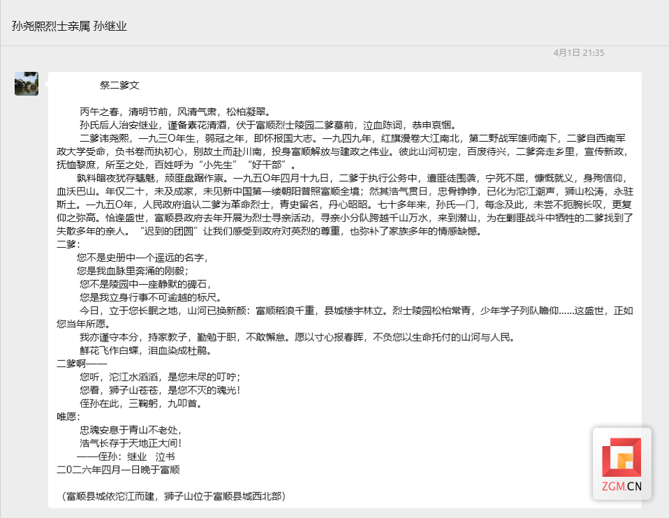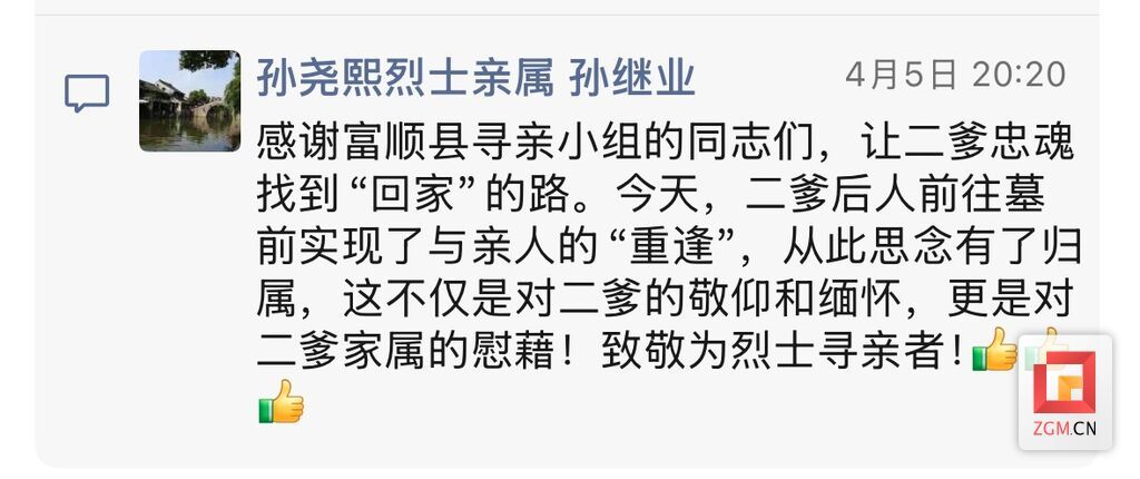 “感谢富顺县寻亲小组的同志们,让二爹忠魂找到了回家的路。” 清明节期间,富顺融媒推出烈士寻亲纪录片后,孙尧熙烈士的侄孙孙继业在视频下方留言:“今天,二爹后人前往墓前,实现了亲人的‘重逢’,从此思念有了归属。这不仅是对二爹的敬仰与缅怀,更是对烈士家属最深切的慰藉!致敬为烈士寻亲者!”