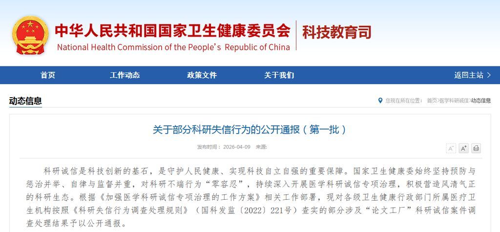 科研诚信是科技创新的基石,是守护人民健康、实现科技自立自强的重要保障。国家卫生健康委始终坚持预防与惩治并举、自律与监督并重,对科研不端行为“零容忍”,持续深入开展医学科研诚信专项治理,积极营造风清气正的科研生态。根据《加强医学科研诚信专项治理的工作方案》相关工作部署,现对各级卫生健康行政部门所属医疗卫生机构按照《科研失信行为调查处理规则》(国科发监〔2022〕221号)查实的部分涉及“论文工厂”科研诚信案件调查处理结果予以公开通报。