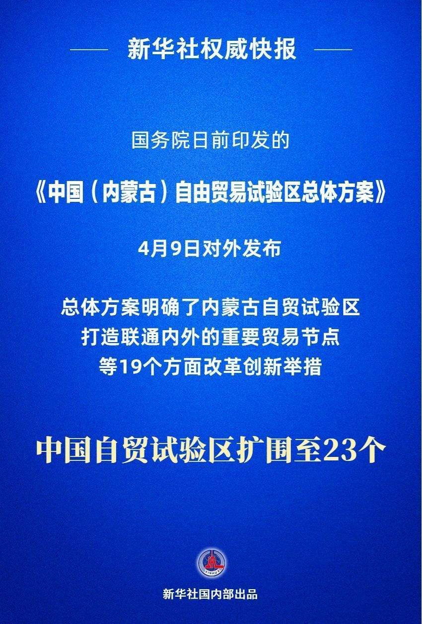 国务院日前印发的《中国(内蒙古)自由贸易试验区总体方案》4月9日对外发布。至此,中国自贸试验区扩围至23个。